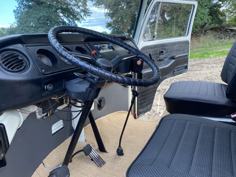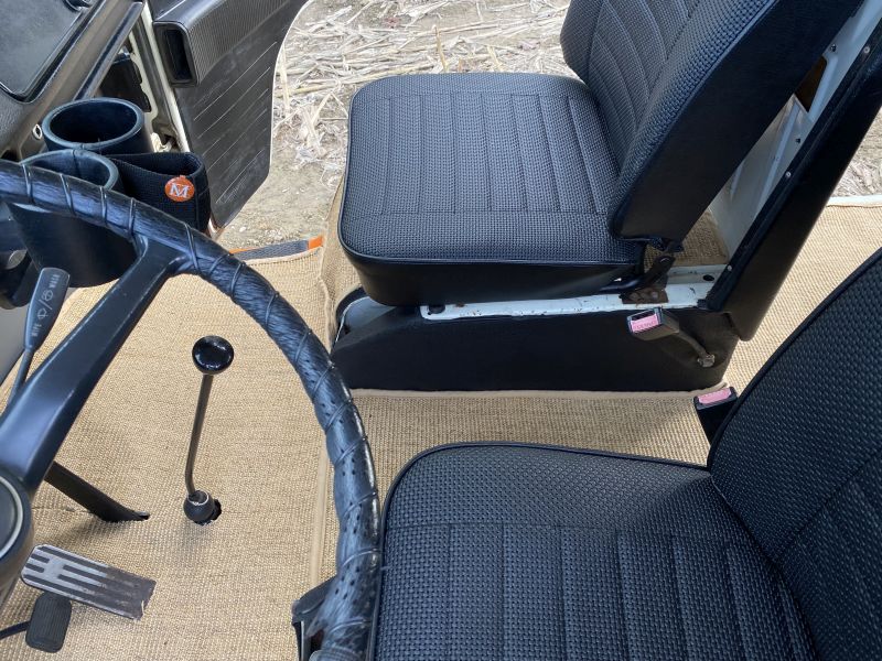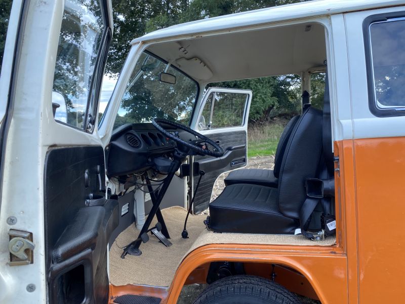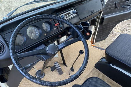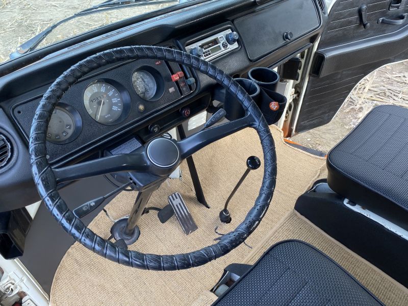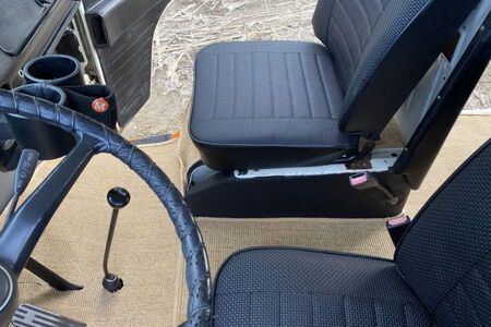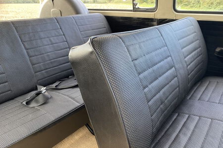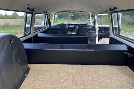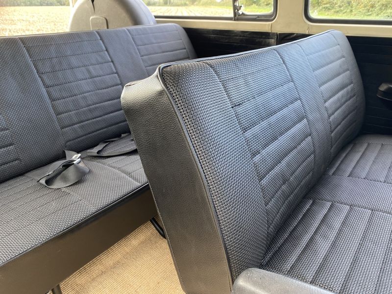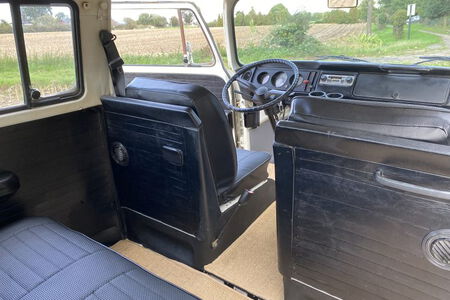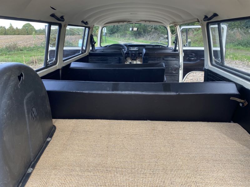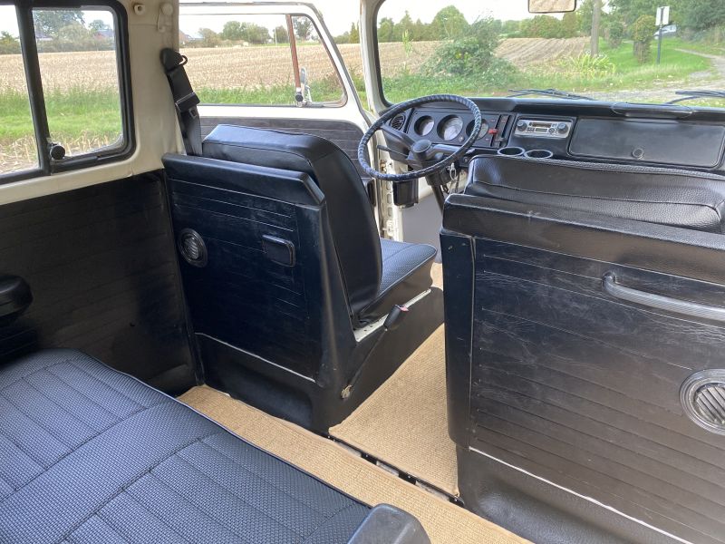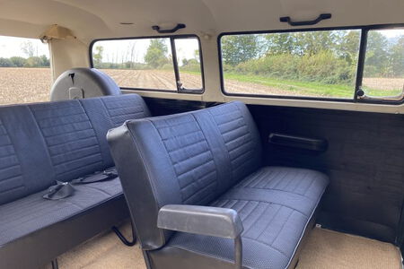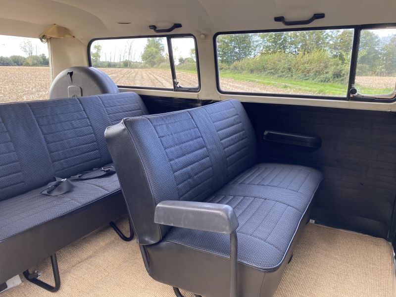 Innen verfügt der Bus über 7 Sitzplätze. Die drei Sitzreihen wurden neu bezogen und der Innenraum mit maßangefertigten Sisalmatten ausgelegt. Himmel und Seitenverkleidungen sind in einem guten Zustand.