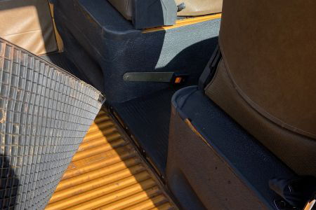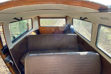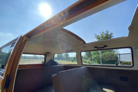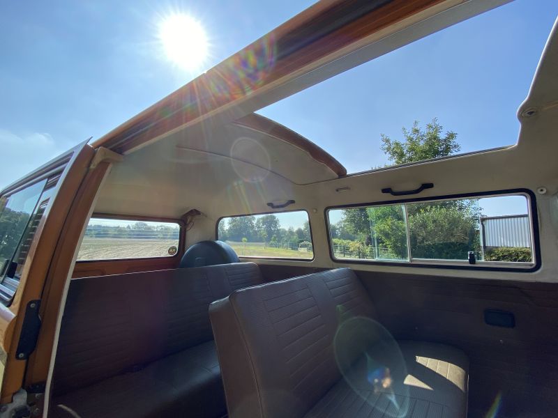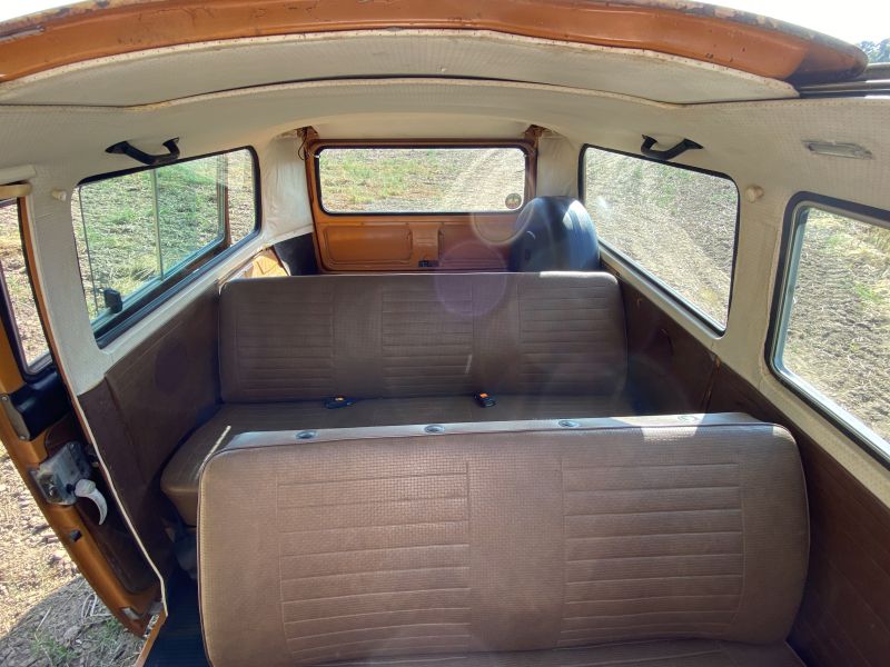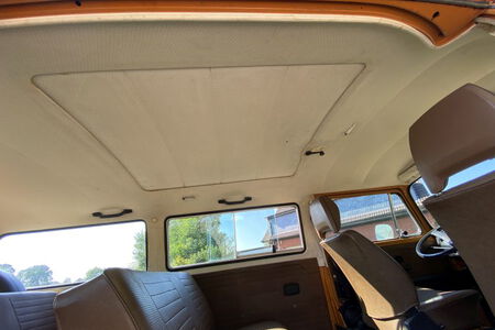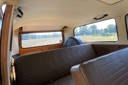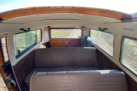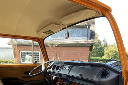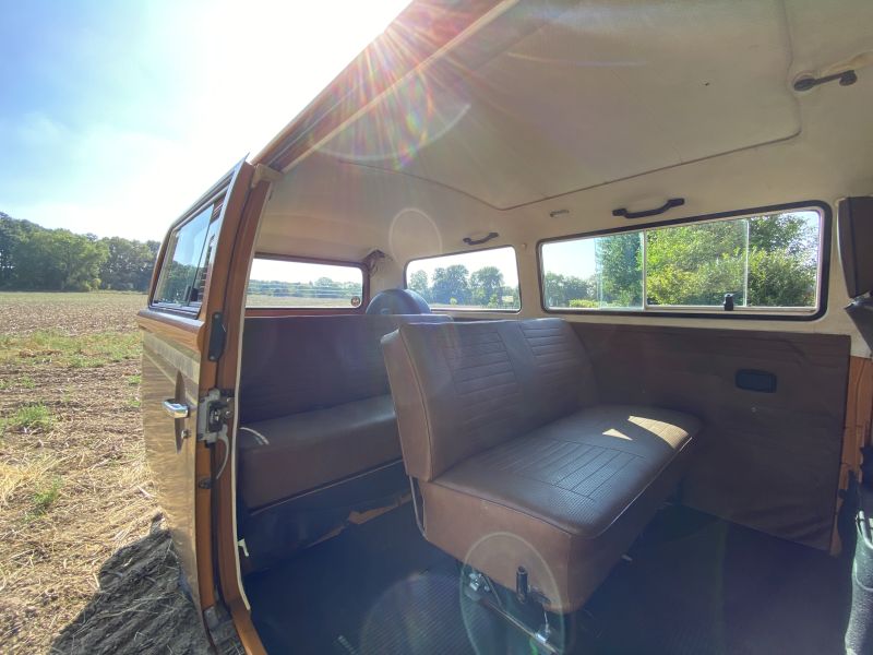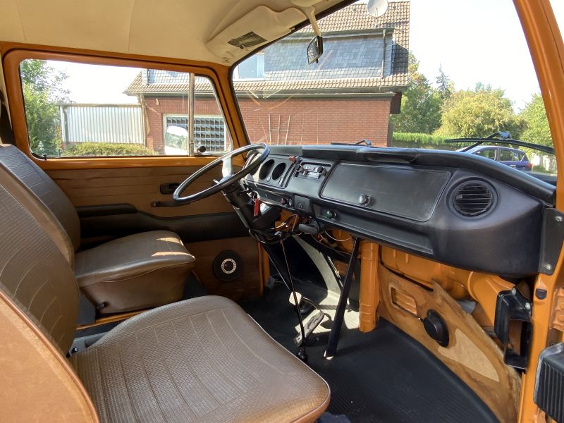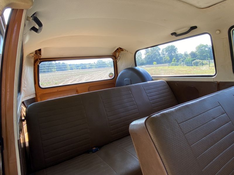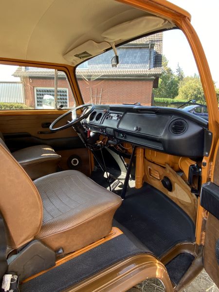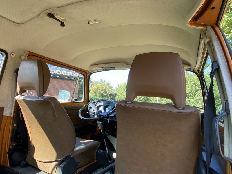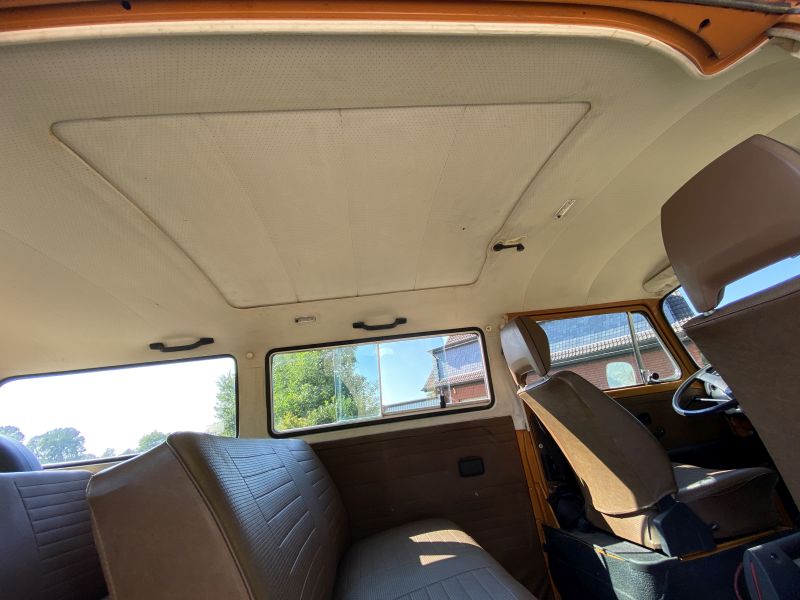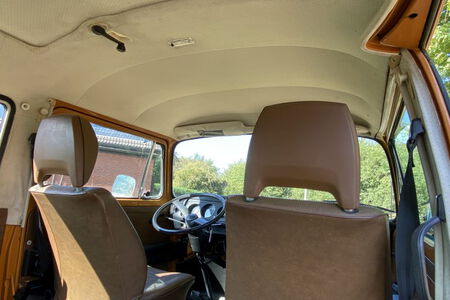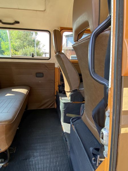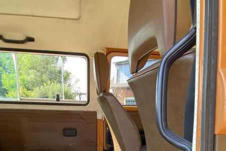 Innen verfügt der Bus über 7 Sitzplätze. Die originale braune Innenausstattung und auch Himmel sind in einem außergewöhnlich gepflegten Zustand.